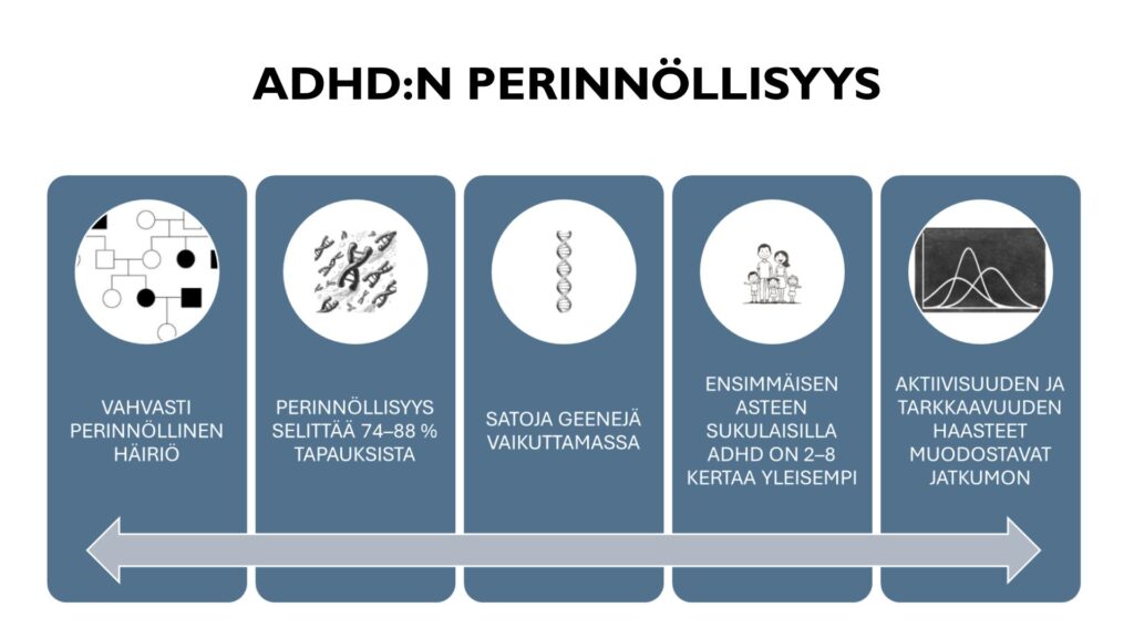ADHD on vahvasti perinnöllinen häiriö. Ensimmäisen asteen sukulaisilla ADHD on 2–8 kertaa yleisempi kuin väestöllä keskimäärin. Aktiivisuuden ja tarkkaavuuden haasteet muodostavat jatkumon, eikä kyseessä ole joko/tai-tilanne. Ympäristö tai kasvatus ei aiheuta ADHD:ta, mutta voi vaikuttaa merkittävästi oirekuvaan